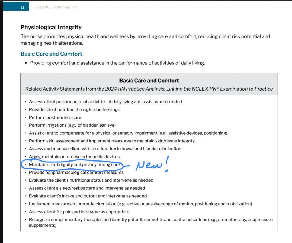 There were absolutely no changes for this section except they made the 2026 column wider. There were no newly added statements and no changes of the wording. You can see for yourself in both the 2023 NCLEX test plan and the 2026 NCLEX test plan.