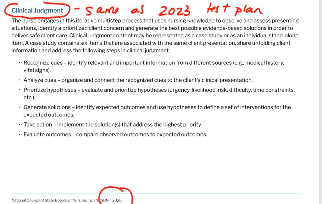 Clinical judgment are the steps you take when you are doing a 6-question case study or a stand-alone case study. This 2026 NCLEX test plan and 2023 NCLEX test plan are identical for this process. The clinical judgment was a new change in 2023 when they introduced the case studies. This was a process that was 10 years in the making! So I’m not surprised that there are NO changes to this.