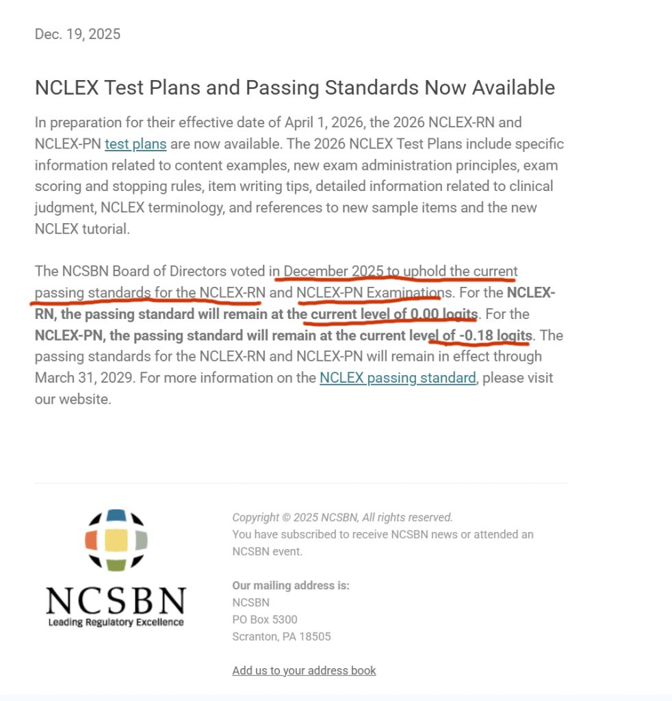 You can see from the image below that this info came directly from an email from NSCBN (the people in charge of the NCLEX). I got the email from them Dec. 19, 2025.