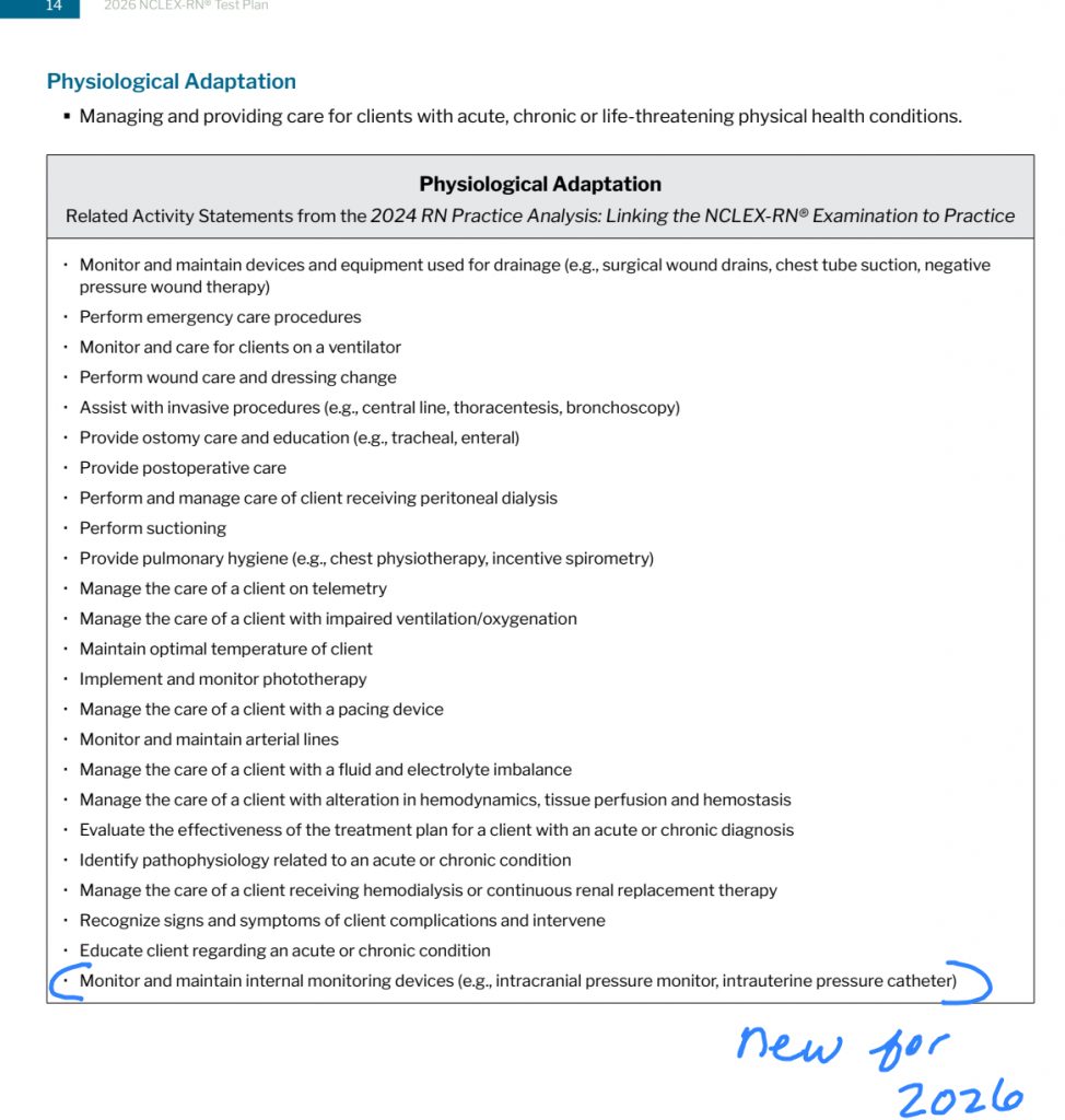 Physiological Adaptation had one added statement to the new 2026 NCLEX Test Plan: “Monitor and maintain internal monitor devices (e.g. intracranial pressure monitor, intrauterine pressure catheter)”