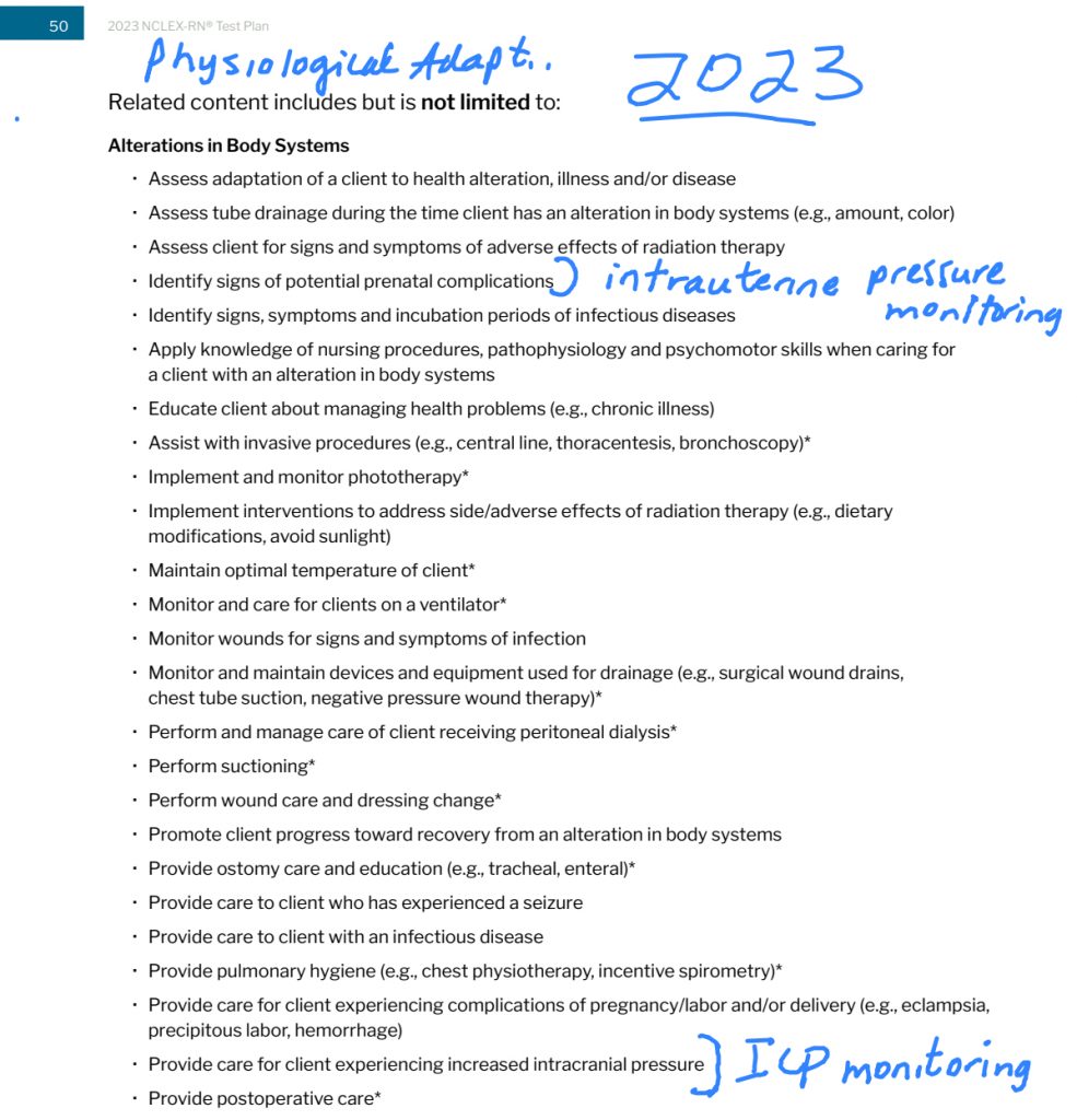 This new statement gives a bit more detailed information on what the NCLEX people want nursing students to know. But in reality, we already knew to monitor ICP and intrauterine pressure. Because in the 2023 test plan it said: