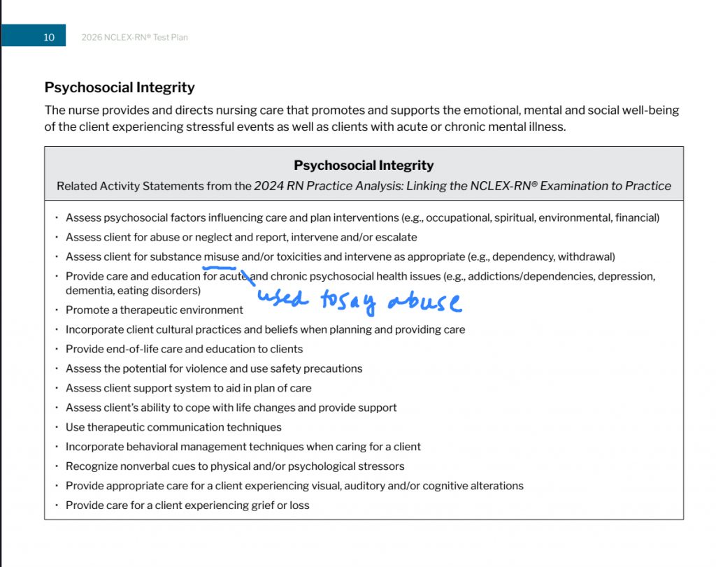 Psychosocial Integrity changed the word “abuse” to “misuse”, regarding substance abuse. Once again for our purposes of passing the NCLEX those two words mean the same thing. Substance misuse or substance abuse? Sounds the same to me!